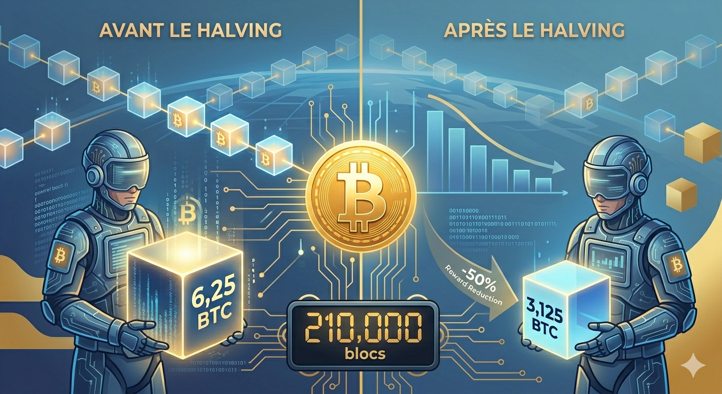 Le halving Bitcoin est un événement programmé tous les 4 ans (tous les 210 000 blocs) qui divise par deux la récompense versée aux mineurs. Ce mécanisme réduit l'émission de nouveaux BTC, créant une rareté qui soutient généralement son prix. La récompense est passée de 6,25 à 3,125 BTC par bloc en 2024.
